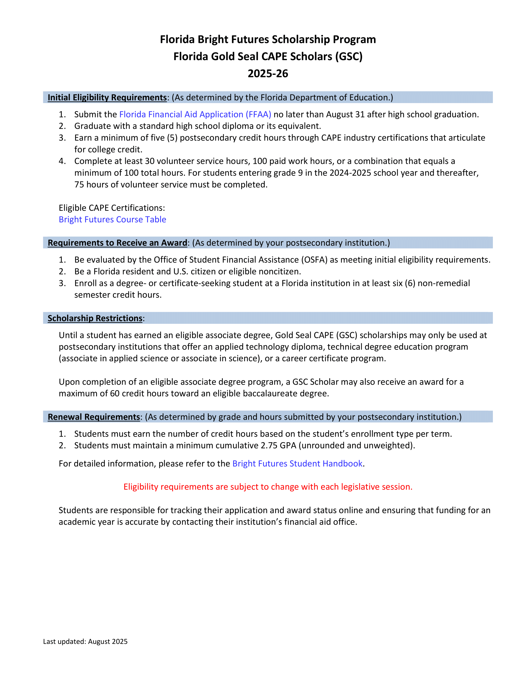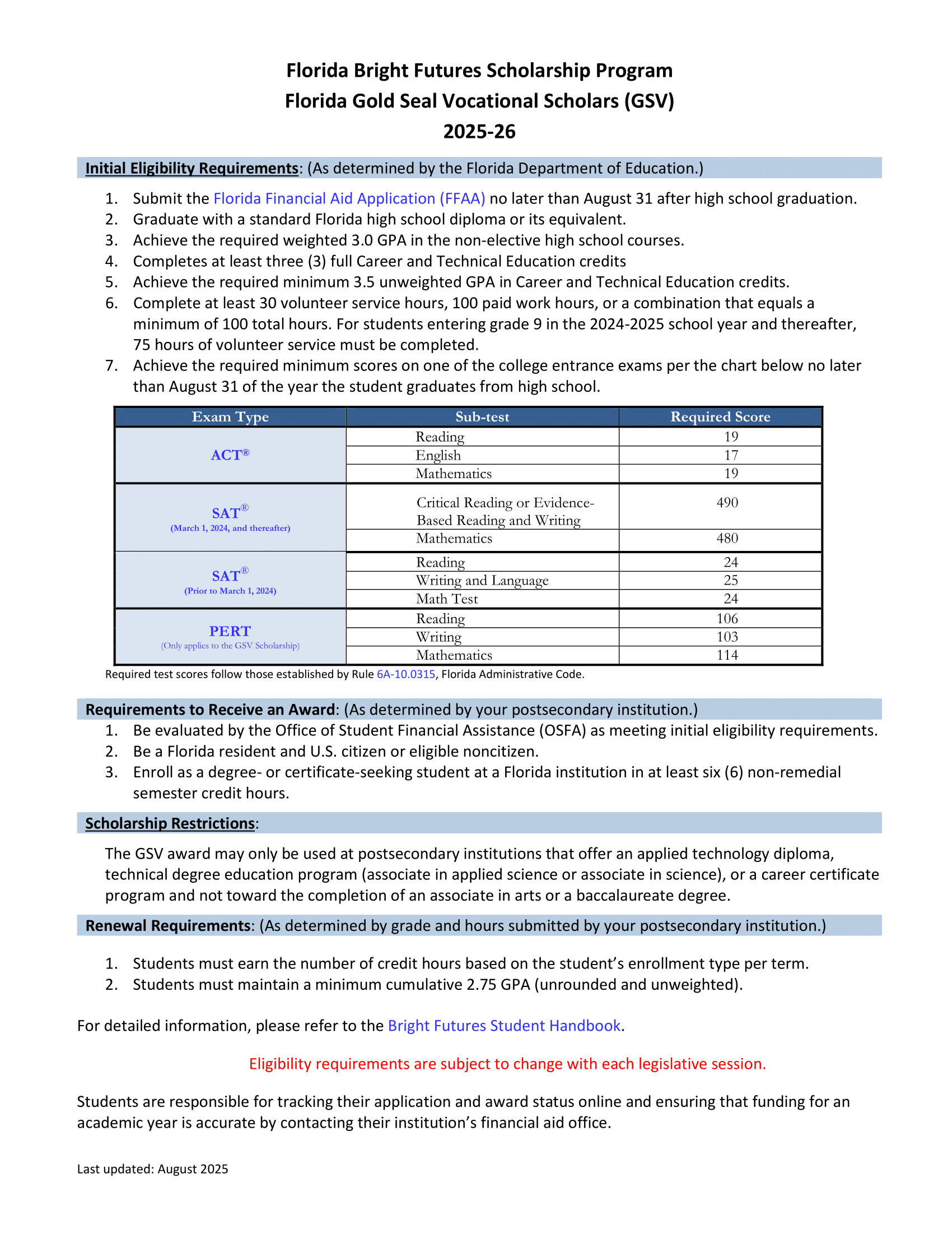 Florida Bright Futures Scholarship Program (FAS/FMS)